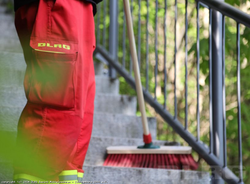 Das Jugend-Einsatz-Team (JET) der Deutschen Lebens-Rettungs-Gesellschaft (DLRG) Mittelsachsen hat am Montag die Treppe hinauf zum Schloß Sachsenburg geputzt. Mit Schaufeln, Besen, und Harken wurden die Verschmutzungen des Winters entfernt. Die Einsatzgruppe entfernte Geröll, Laub und Schmutzablagerungen entlang der 264 Stufen. Am kommenden Sonntag, den 28. April richtet die DLRG Mittelsachsen den 5. Sachsenburger Schloßtreppenlauf aus, welcher auf der frisch geputzten Treppe stattfinden wird.